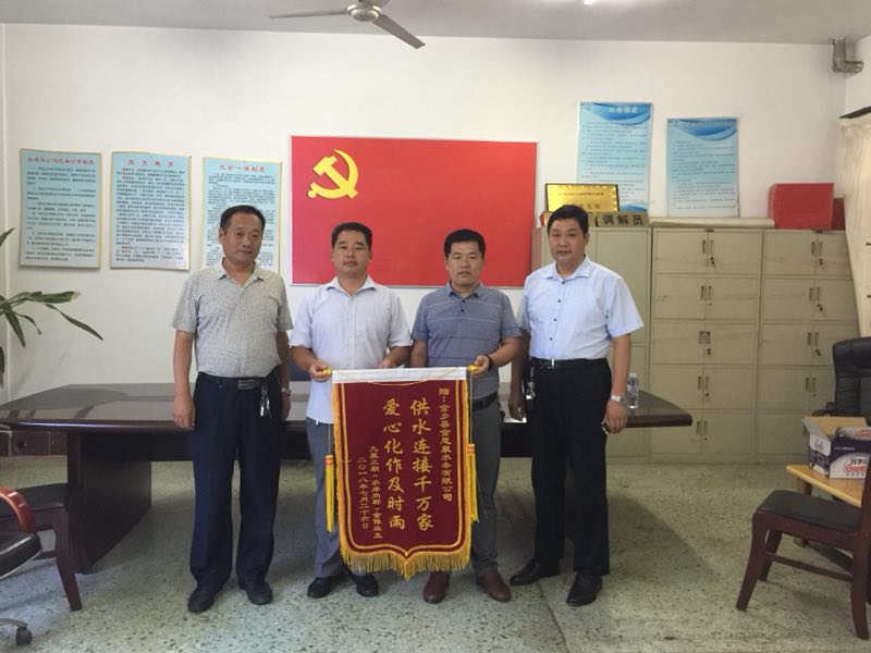 7月27日上午,金鄉(xiāng)縣水岸尚郡的業(yè)主代表將一面繡有“供水連接千萬家,愛心化作及時(shí)雨”的錦旗送到金思泉水務(wù)有限公司,感謝公司心系群眾、及時(shí)解決了居民用水困難問題。金鄉(xiāng)縣金思泉水務(wù)有限公司副經(jīng)理常家偉、黨支部副書記孔德民熱情接待了業(yè)主代表。
