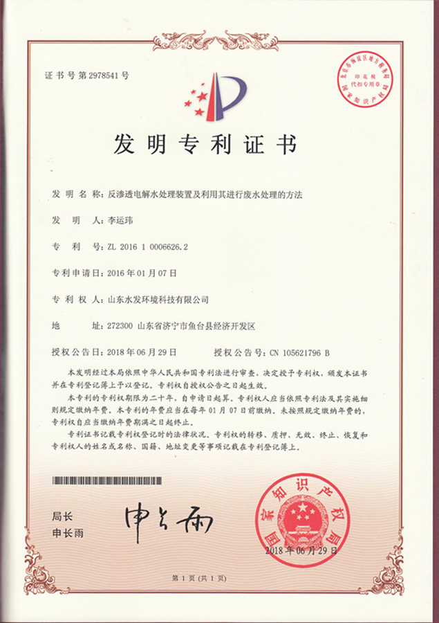 近日,山東水發(fā)環(huán)境科技有限公司自主研發(fā)的《反滲透電解水處理裝置及利用其處理廢水的方法》成功獲國家知識(shí)產(chǎn)權(quán)局授權(quán)并頒發(fā)發(fā)明專利證書。