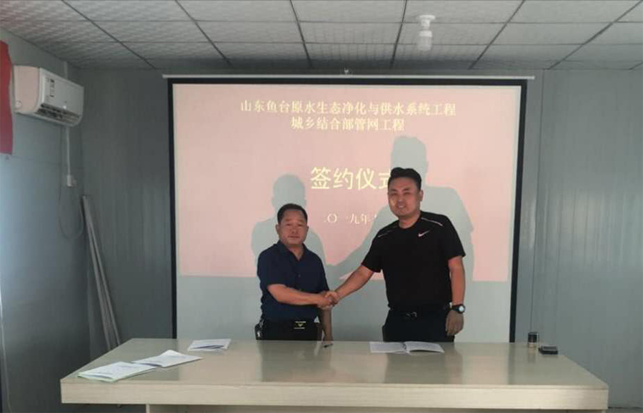 5月21日下午,山東魚臺原水生態凈化與供水系統工程城鄉結合部管網工程施工簽約儀式在魚臺縣順利舉行。水發金水建設工程有限公司總經理蘇福貴、山東水發賢達水務有限公司總經理潘愛國出席并簽訂了合同。